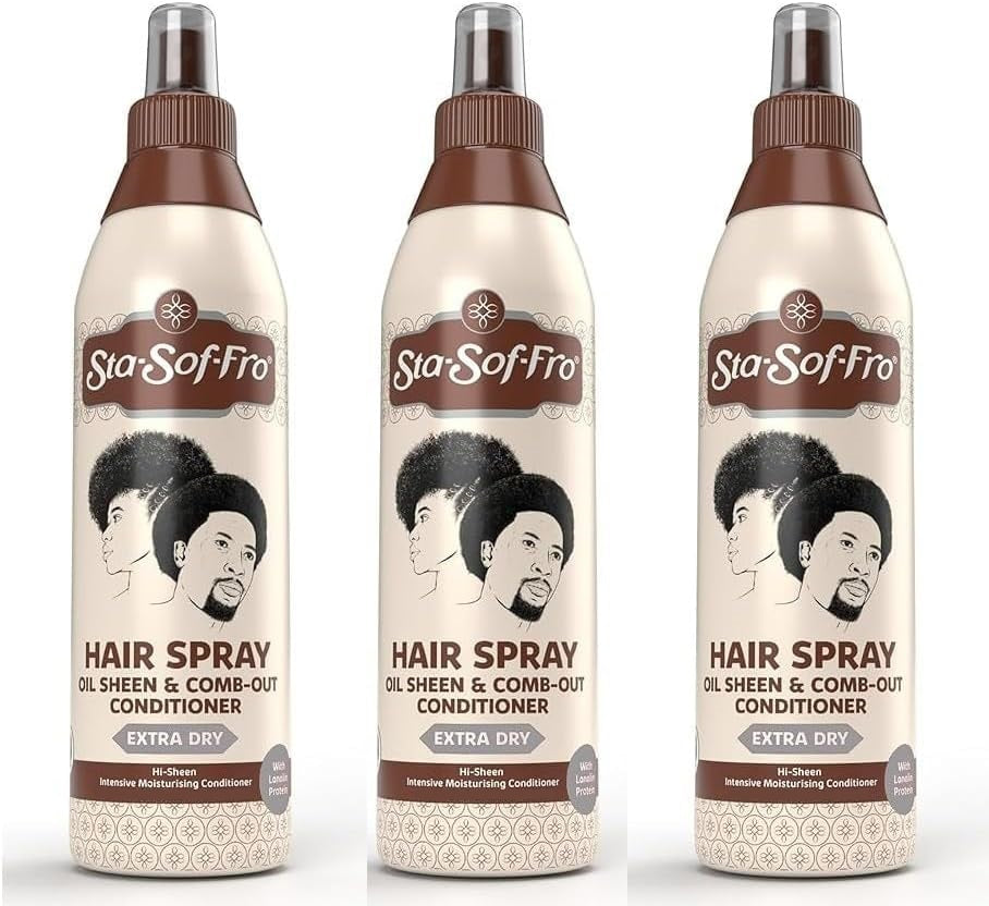 Sta-Sof-Fro Hair Spray is an advanced blend of softeners, protein and conditioners designed for dry and damaged hair. It has added moisturisers and conditioners to soften hard to comb and unmanageable hair with lasting shine. Special formulation recommended by professional stylists for maintenance of natural hair curls, waves and braids. Suitable for the whole family.
