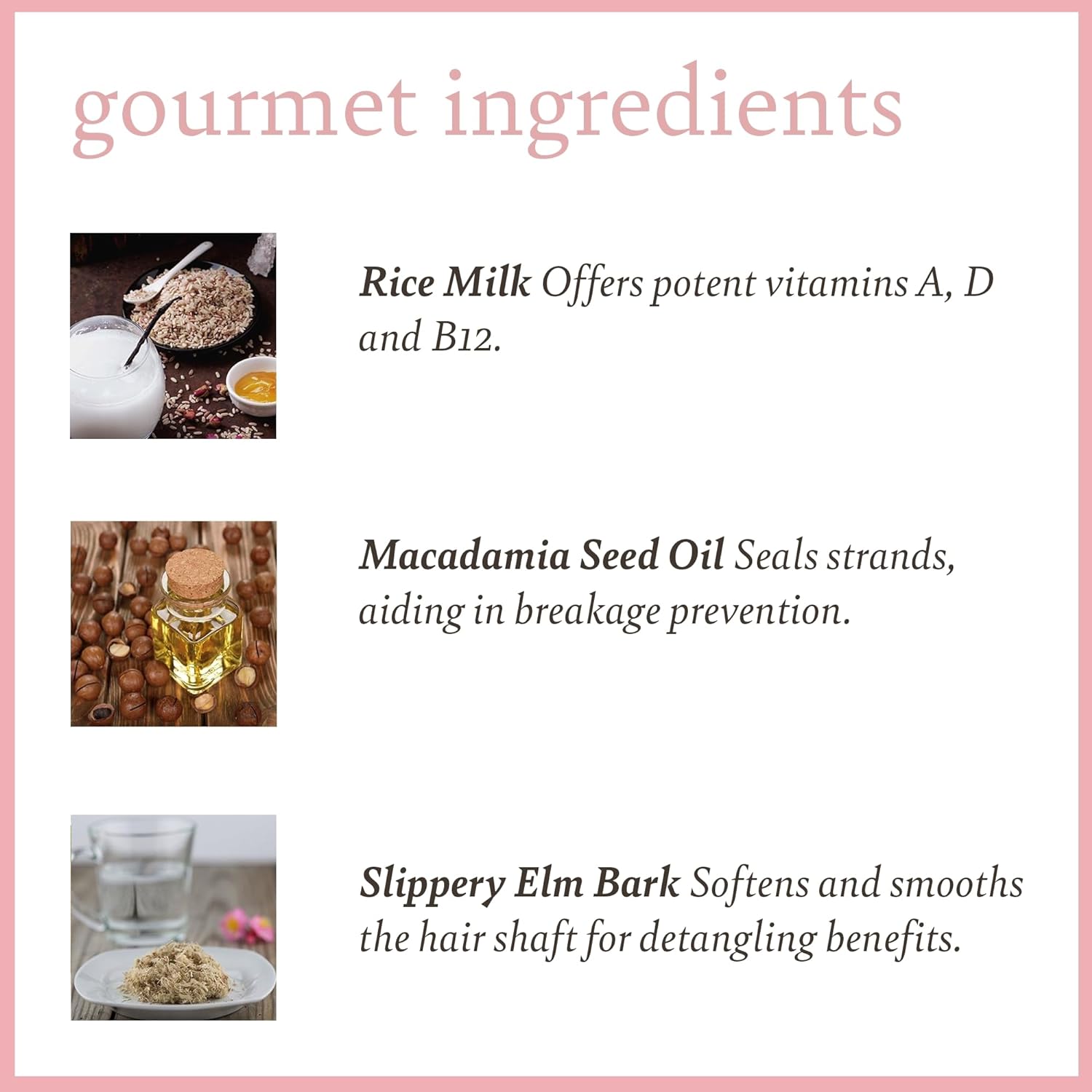 Huile de graines de macadamia, lait de riz et extrait d'écorce d'orme combinent leurs pouvoirs émollients et fortifiants pour créer un soin véritablement nourrissant Après-shampoing sans rinçage.