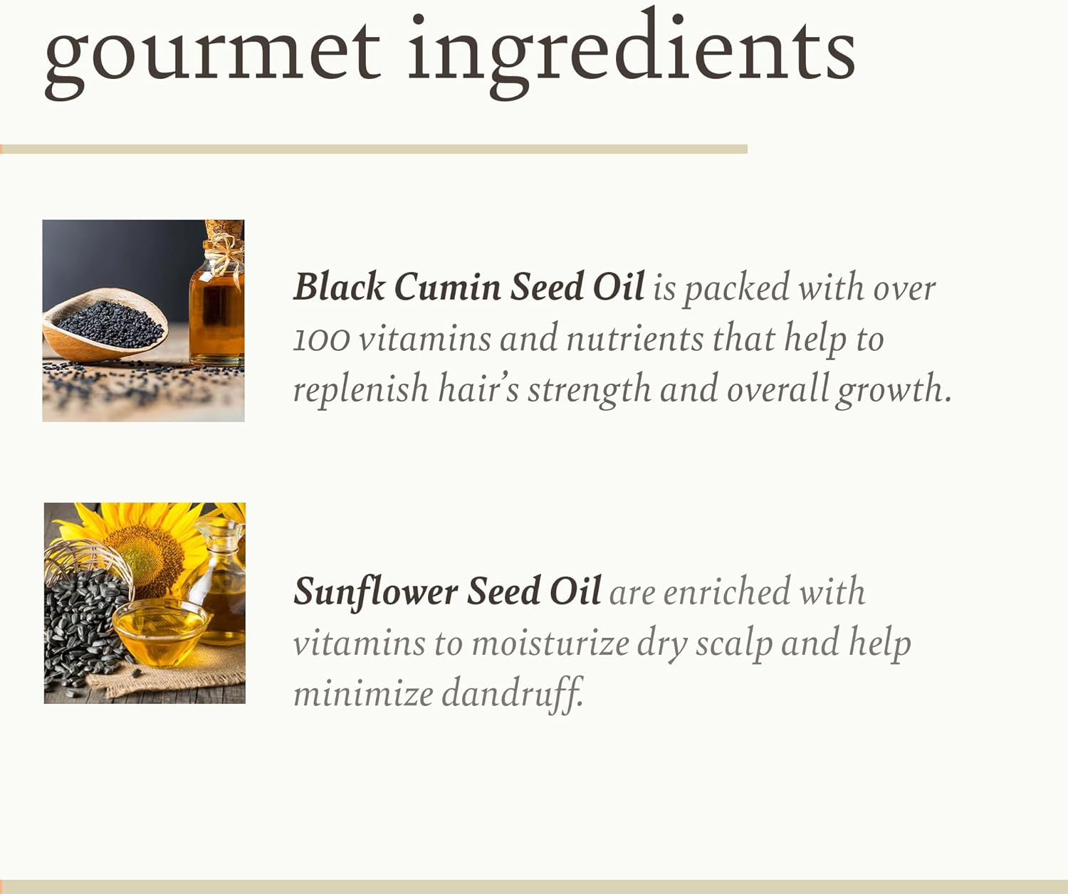 Les ingrédients actifs de l’huile de graines de cumin noir et de l’huile de graines de tournesol regorgent de nutriments essentiels que vos cheveux adoreront.