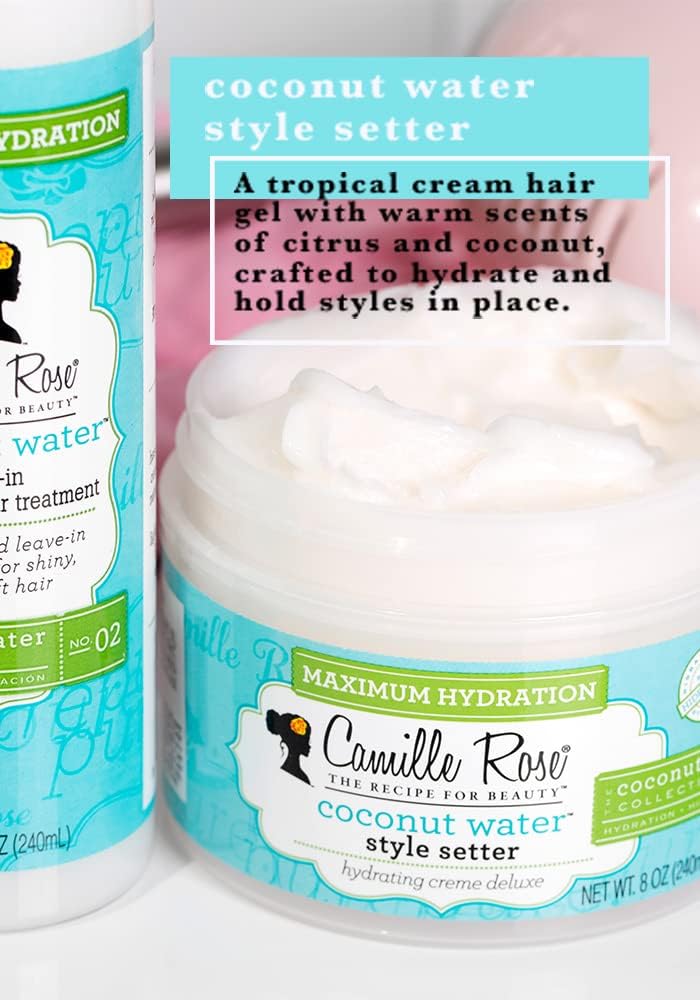 Notre gel coiffant à l'eau de coco est un gel capillaire pour cheveux bouclés qui hydrate et maintient fermement les coiffures en place.
