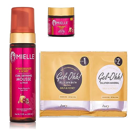 Coffret de coiffure Mielle Pomegranate Honey : mousse définissant les boucles et gel contour avec bain de pieds AvryBeauty Gel-Ohh Jelly Spa au lait et au miel en bonus