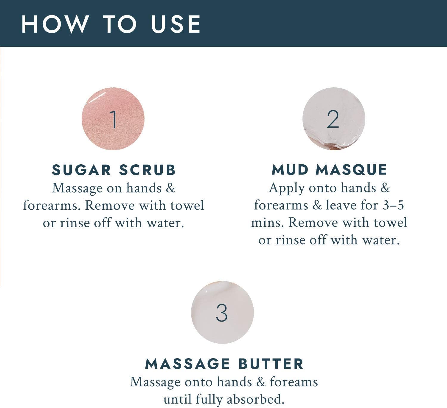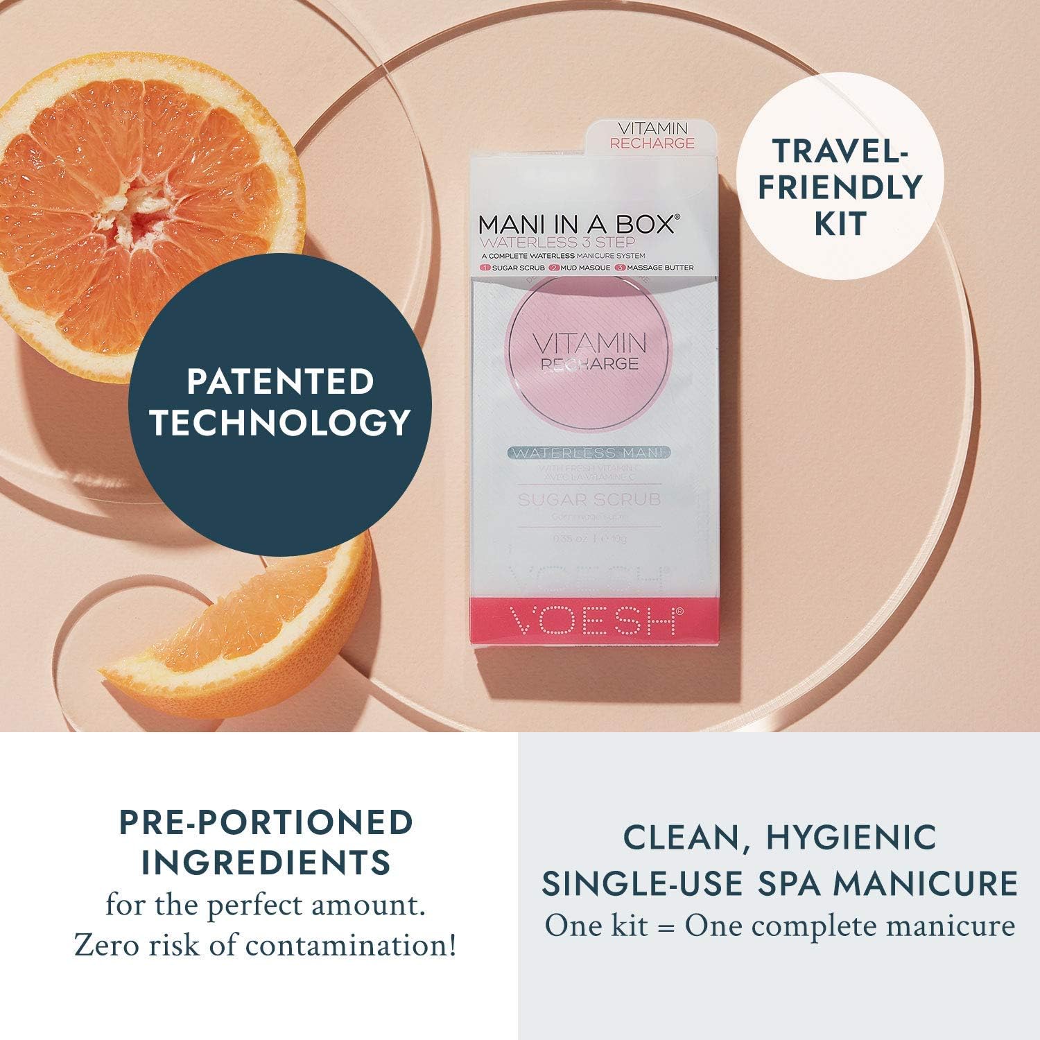 Le kit de manucure sans eau VOESH est un traitement en 3 étapes. Enrichi en ingrédients clés pour apporter à vos mains la nutrition dont elles ont besoin. Chaque produit est emballé individuellement avec la quantité parfaite pour une seule manucure. Coffret comprenant un gommage, un masque de boue et une crème de massage. Toujours vegan. Sans cruauté et sans parabène