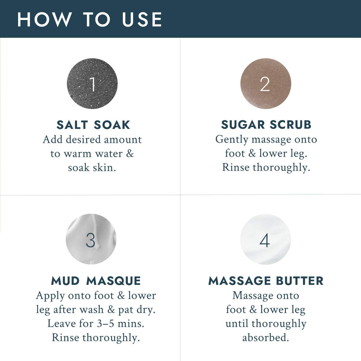 VOESH Pedi in a Box Deluxe est un traitement en 4 étapes. Enrichi en ingrédients clés pour apporter à vos pieds la nutrition dont ils ont besoin. Chaque produit est emballé individuellement avec la quantité nécessaire pour une seule pédicure. Comprend un bain de sel marin, un gommage au sucre, un masque de boue et une crème de massage. Toujours fabriqué végétalien, sans cruauté et sans parabène.