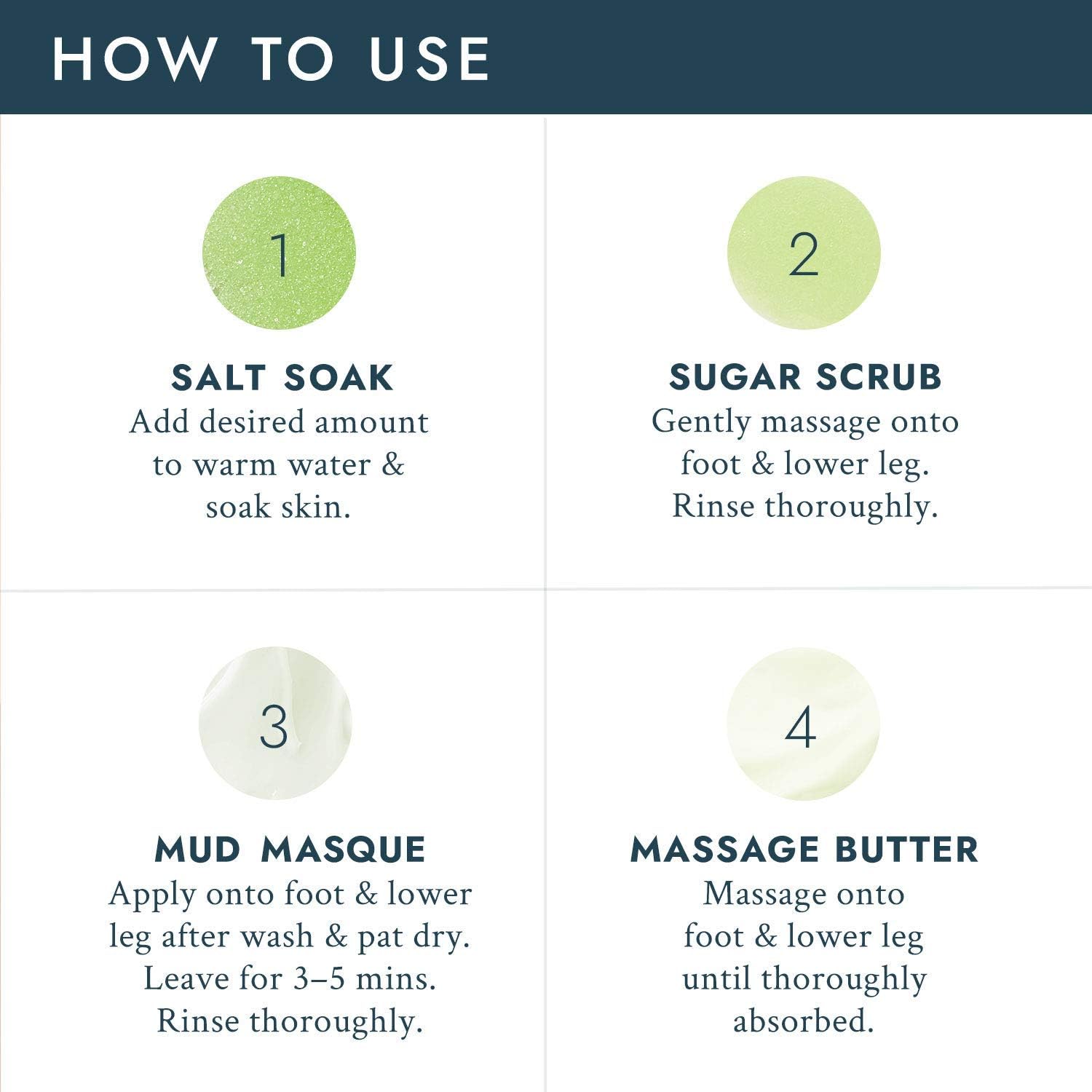 La collection de pédicure spa individuelle au thé vert de Voesh est une collection en quatre étapes traitement qui enrichit la peau avec des ingrédients clés pour donner aux pieds beaucoup nutriments essentiels. Chaque coffret est emballé individuellement avec la quantité appropriée de produit pour une seule pédicure, assurant un spa propre et hygiénique Solution de pédicure. Chaque coffret comprend un bain de sels minéraux marins, un bain de pieds Système de gommage, masque de boue et lotion de massage.