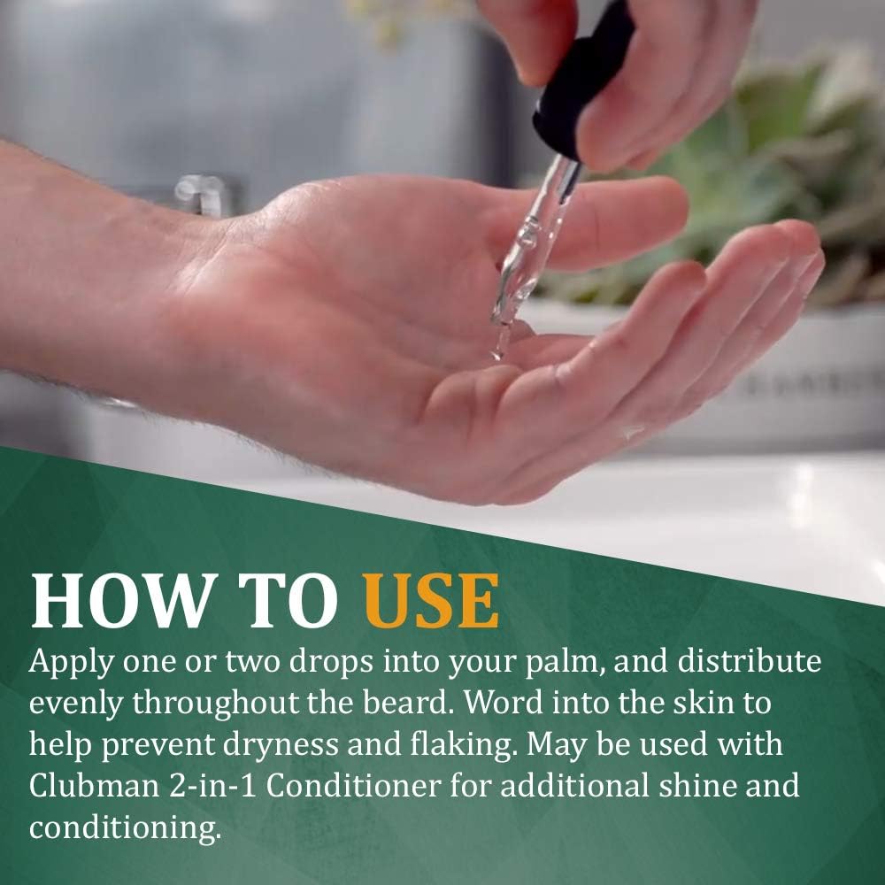 Appliquez une ou deux gouttes dans votre paume et répartissez uniformément la barbe. Appliquer sur la peau pour prévenir la sécheresse et la desquamation. être utilisé avec le revitalisant Clubman 2 en 1 pour plus de brillance et conditionnement.