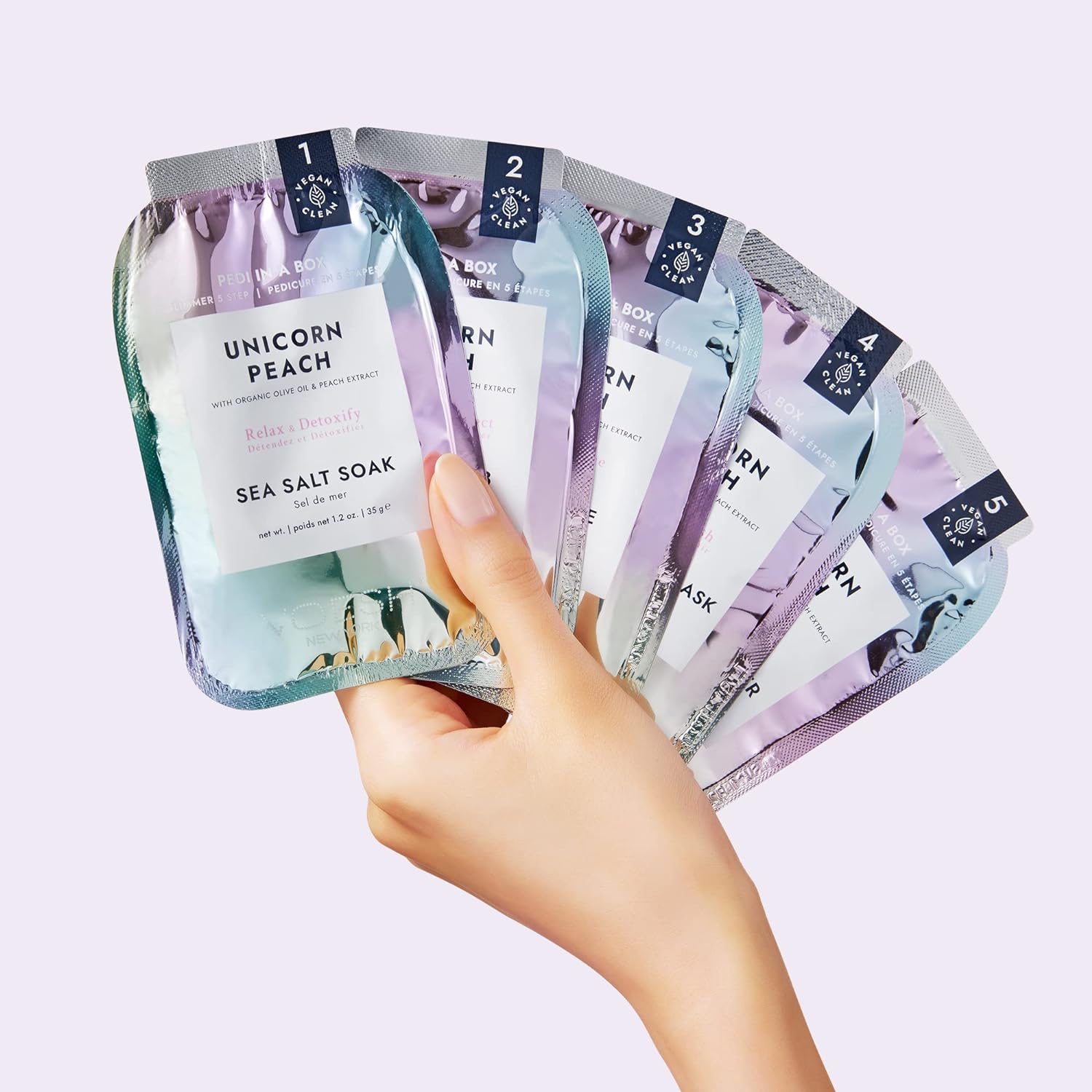 Être votre plus radieuse avec notre Pedi in a Box Glimmer 5 Step Unicorn Peach Duo, un pack de deux kits de pédicure spa qui rendront votre peau scintiller et briller.