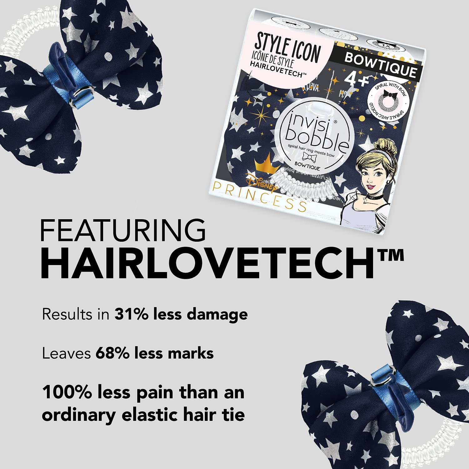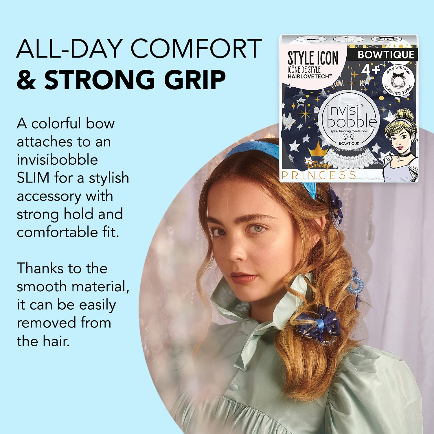• Spiral Ring Meets Hair Bow: Every princess needs a bow in her hair! The invisibobble Disney Princess Cinderella BOWTIQUE transforms classic ponytails and voluminous buns into trendy looks with little-to-no effort. The integrated double bow makes your hairstyle look effortless and cool while turning the invisibobble SLIM into the ultimate trend accessory. Ages 4+.